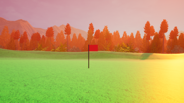 The hard part was creating the theme for the level so I looked around for inspiration and found colourful autumn themed images and used warm colours like red, brown and yellow for the vegetation and lighting which makes the green grass pop out amongest the warm colours. From there I added various vegetation and surrounded the map with some mountains. The result is a beautiful sunrise that illuminates the entire course.